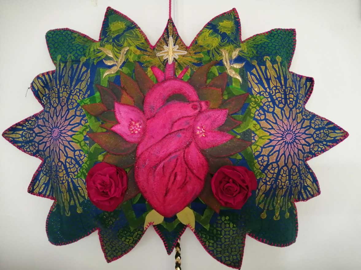 Suspendue dans l’espace, l’œuvre semble flotter comme un cœur vivant, à la fois fragile et puissant. Les détails brodés, les lignes cousues et les formes florales viennent dialoguer avec l’anatomie, créant un contraste entre précision, douceur et pulsation intérieure.