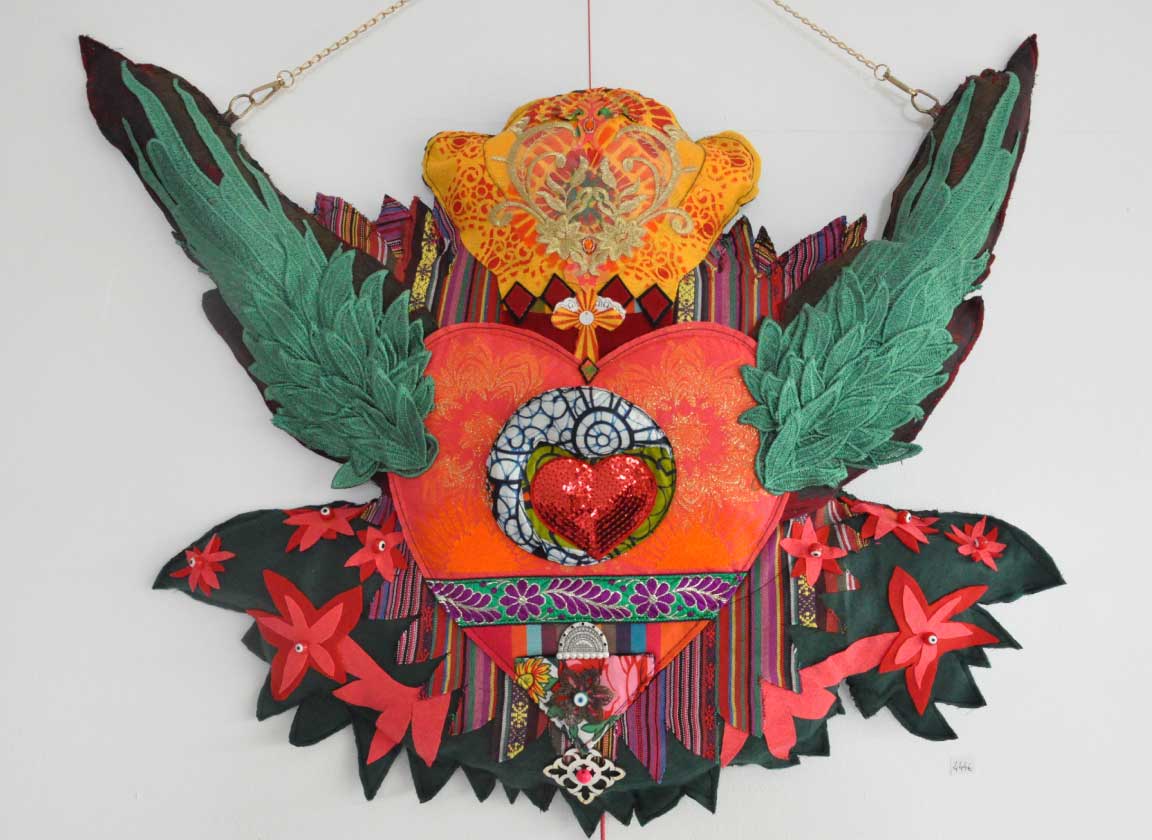 L’artiste travaille la matière, le fil et la couture pour créer un cœur vibrant. Les textures rappellent la mémoire du corps. Les lignes suggèrent un mouvement intérieur. L’ensemble dégage une présence sensible et presque rituelle.