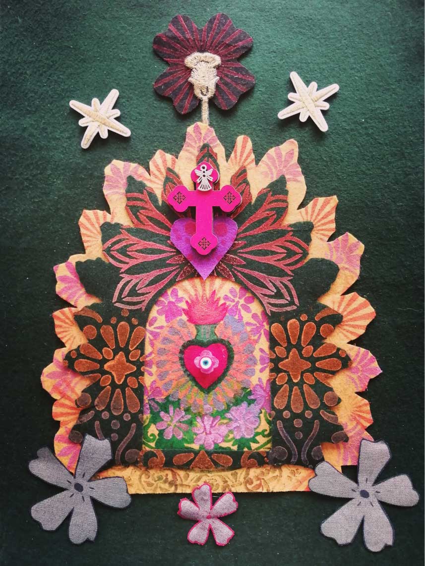 Par le fil, la matière et le geste, l’artiste compose une œuvre vibrante où chaque relief raconte une pulsation intérieure. Les textures, organiques et charnelles, évoquent la chair du vivant, les battements enfouis, les empreintes émotionnelles. L’ensemble dégage une présence presque rituelle, comme un objet de passage entre l’intime et le sacré. Coeurs sacrés – Reliques talisman invite à ressentir, à ralentir, à se relier à ce qui palpite en profondeur.