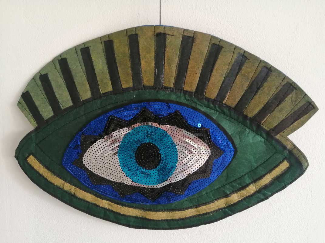 L’Œil d’Orus mobile est une œuvre originale d’Aurellll’Art, réalisée en 2024 à La Réunion. Cette création en broderie et couture en volume se déploie en suspension, comme un talisman protecteur chargé de symbolique. L’œil central, puissant et lumineux, évoque la vigilance, la protection et la conscience. Il s’inscrit dans une structure textile finement brodée, prolongée de franges qui accompagnent les mouvements de l’air.